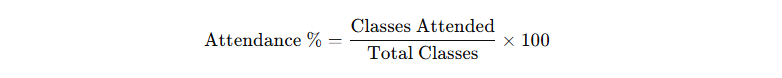 Attendance % = (Classes Attended ÷ Total Classes) × 100