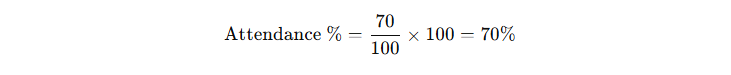 Attendance % = (85 ÷ 120) × 100 = 70.83%